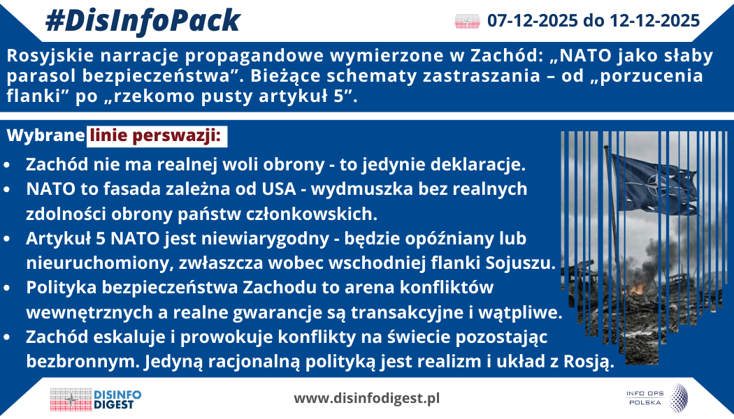 Podsumowując, prochińska narracja uderzająca w więzi transatlantyckie stanowi element działań informacyjnych, mających na celu podważenie fundamentów sojuszu NATO i osłabienie pozycji USA w Europie. Wykorzystując faktyczne napięcia i kontrowersje, przedstawia fałszywe alternatywy, manipulując emocjami i logiką odbiorców. Poprzez podważanie znaczenia wartości demokratycznych, budowanie fałszywego obrazu Chin jako neutralnego i racjonalnego gracza oraz hiperbolizowanie problemów wewnątrz wspólnoty zachodniej, narracja ta osłabia zaufanie do sojuszy i promuje strategiczne interesy Pekinu i Moskwy. Jej upowszechnianie, zwłaszcza przez osoby cieszące się autorytetem i zasięgami, może prowadzić do erozji poparcia społecznego dla współpracy transatlantyckiej, co w dłuższej perspektywie grozi osłabieniem bezpieczeństwa Polski i podważeniem ładu międzynarodowego opartego na wartościach Zachodu.